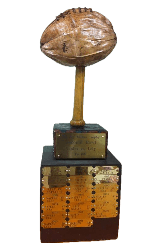 began on Thanksgiving Day in 1974. The "Coconut Bowl" was the brainchild of the school principals - Clyde Quinby from the upstart Lely Trojans and Dave Jacobs of the established Naples Golden Eagles. Naples High was split into two schools with Naples High remaining on the North side of town and Lely taking over in East Naples. The winner of this fall classic would lay claim to the "Nut", and keep it until the next game when once again, it would go to the winner. Lely won the first contest, and the next 24 games were split with Naples winning 12 and Lely winning 12. Since then, Naples has dominated the series, taking an overall 37-15 advantage in games won.