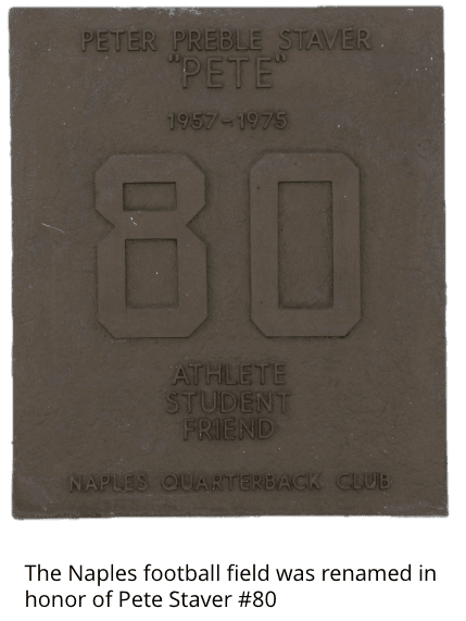 Staver Field was named in honor of Naples High Senior Peter Preble “Pete” Staver, who died November 24, 1975. He was injured in the 4th Quarter of the last varsity football game of the season against Key West. He died 3 days later. This is the story as reported by staff writer Ron Martz of the St. Petersburg Times on Sunday, October 10, 1976. The original article is displayed in the trophy case in the gymnasium at Naples High.